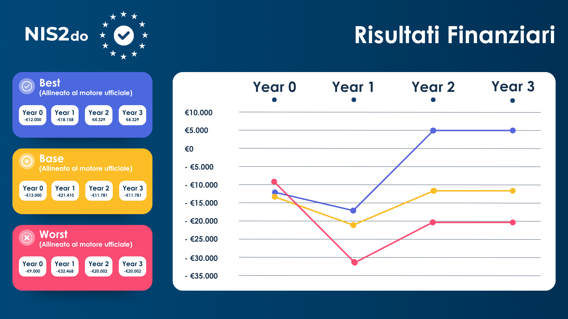 NIS2do interpreta le Misure di Sicurezza ACN in relazione ai processi aziendali, identificando gli obblighi realmente applicabili al contesto specifico dell'organizzazione. Il risultato è una stima affidabile di effort e budget necessari per l'adeguamento, e la capacità di quantificare con precisione quanto si può risparmiare scegliendo soluzioni più evolute rispetto a un percorso tradizionale.